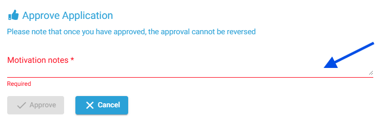 When prompted, enter Motivation Notes explaining the reason for approval. This information is mandatory and will be recorded on the final application.